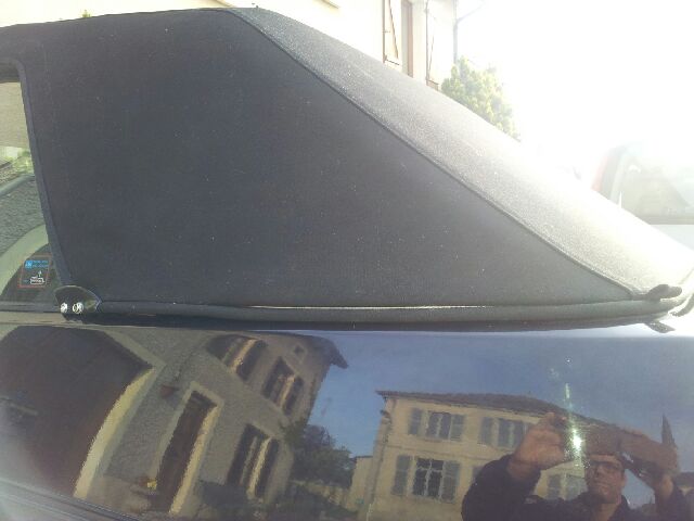 Pour les côtés, c'est une autre histoire puisque la réservation de la goulotte n'est plus à l'horizontale mais remonte vers le haut. lorsque je tends le câble de chaque côté, la platine pour l'embout fileté étant placée en dessous de la dite goulotte, il tend à se placer vers le bas. résultat : le câble est tendu mais il apparait ce qui est disgracieux ( et ch*** parce que ce n'était pas le cas avec l'ancienne capote en vinyle et que le résultat est impecc sur les nombreuses photos de cab du forum ...).