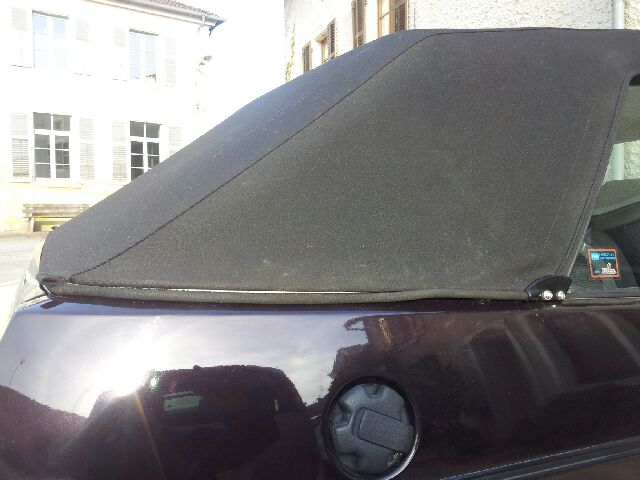 Pour les côtés, c'est une autre histoire puisque la réservation de la goulotte n'est plus à l'horizontale mais remonte vers le haut. lorsque je tends le câble de chaque côté, la platine pour l'embout fileté étant placée en dessous de la dite goulotte, il tend à se placer vers le bas. résultat : le câble est tendu mais il apparait ce qui est disgracieux ( et ch*** parce que ce n'était pas le cas avec l'ancienne capote en vinyle et que le résultat est impecc sur les nombreuses photos de cab du forum ...).