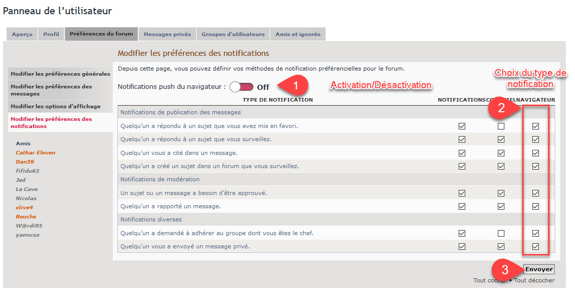 Pour paramétrer vos notifications de manière complète vous pouvez accéder à leur configuration dans votre panneau utilisateur, rubrique préférences du forum