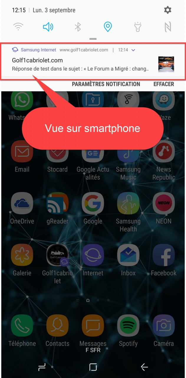 Vous pouvez être notifié par votre navigateur web (si il est compatible) sur PC ou Smartphone des notifications de réponse aux sujets/forums que vous suivez, ou lorsque vous avez été cité par exemple.