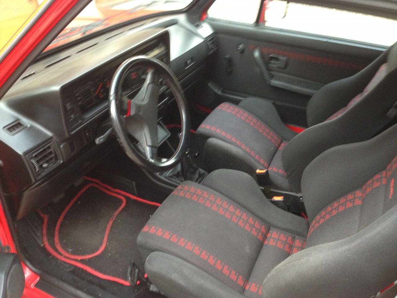 J’aimerais devenir heureux propriétaire d’une Golf 1 cabriolet, je piste un modem Sportline 1,8 98cv rouge flash de 1992 de 160000kms, moteur 2H, immatriculée au Luxembourg, import Allemand, donc capote et vitres manuels. Il manque les jantes BBS RA 15 pouces d’origines, elle n’a pas le carnet d’entretien confirmant l’historique, pour le reste c’est Ok.