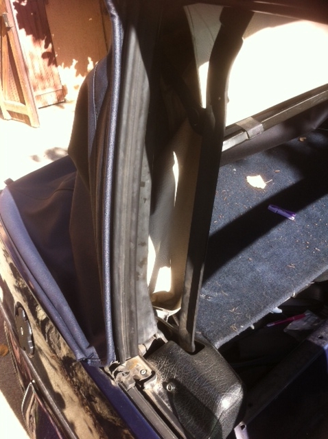 Regarde sur la première photo de la capote bleue, tu vois que le bourrelet est dirigé vers l avant perpendiculairement au montant alors que toi il pointe vers l extérieur. C est en le re positionnant que tu élimineras les plis