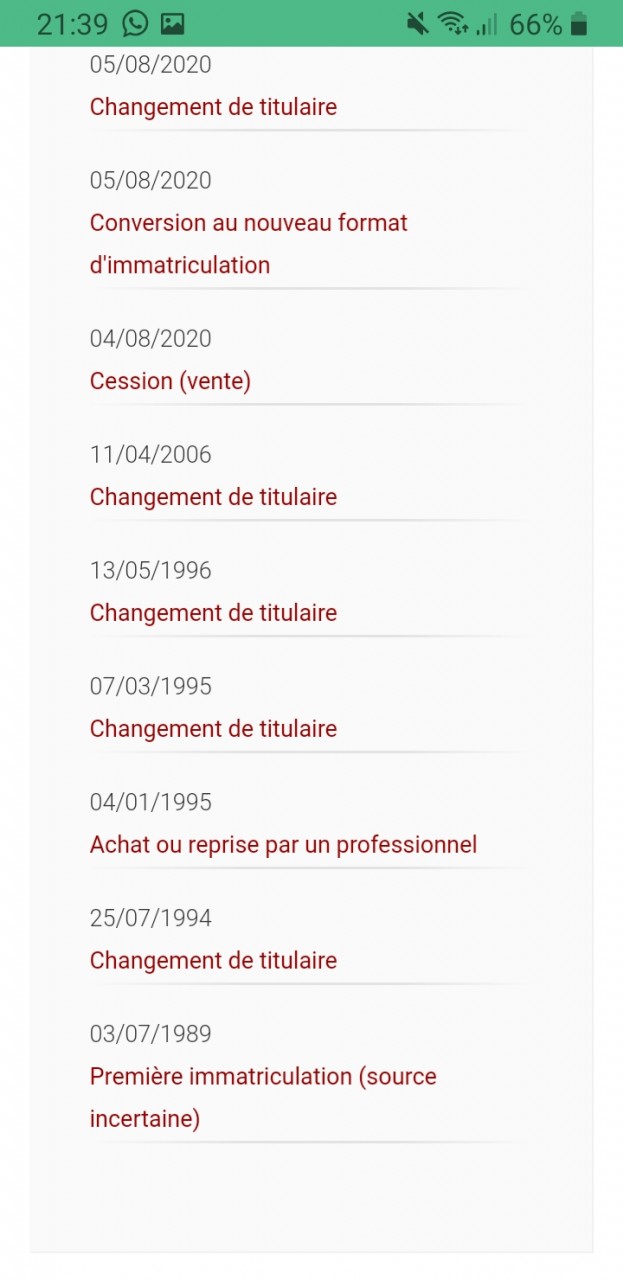 Super ! Je viens aussi de le faire et je retrouve le nombre de propriétaires, je suis le 4ieme ... tout corrobore avec le dossier par contre je n’ai pas les historiques de CT , je les ai en papier j’aurai bien aimé avoir le même rapport que le tien