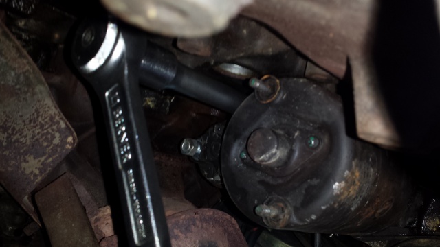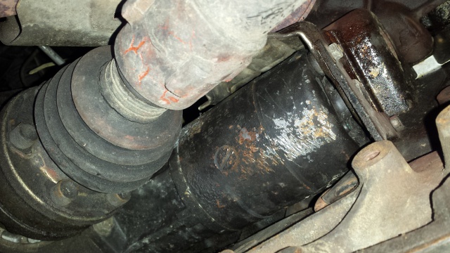 Hop, on se glisse sous la voiture. Le démarreur se trouve donc près du collecteur d'échappement (son défaut), au dessus du soufflet de cardan intérieur droit. Il est accessible que par le dessous du véhicule. (notez les coups de marteau...). Tout d'abord, il faut desserrer les 2 écrous de 10 qui maintiennent la patte en "L" et un cache métallique troué, à droite :