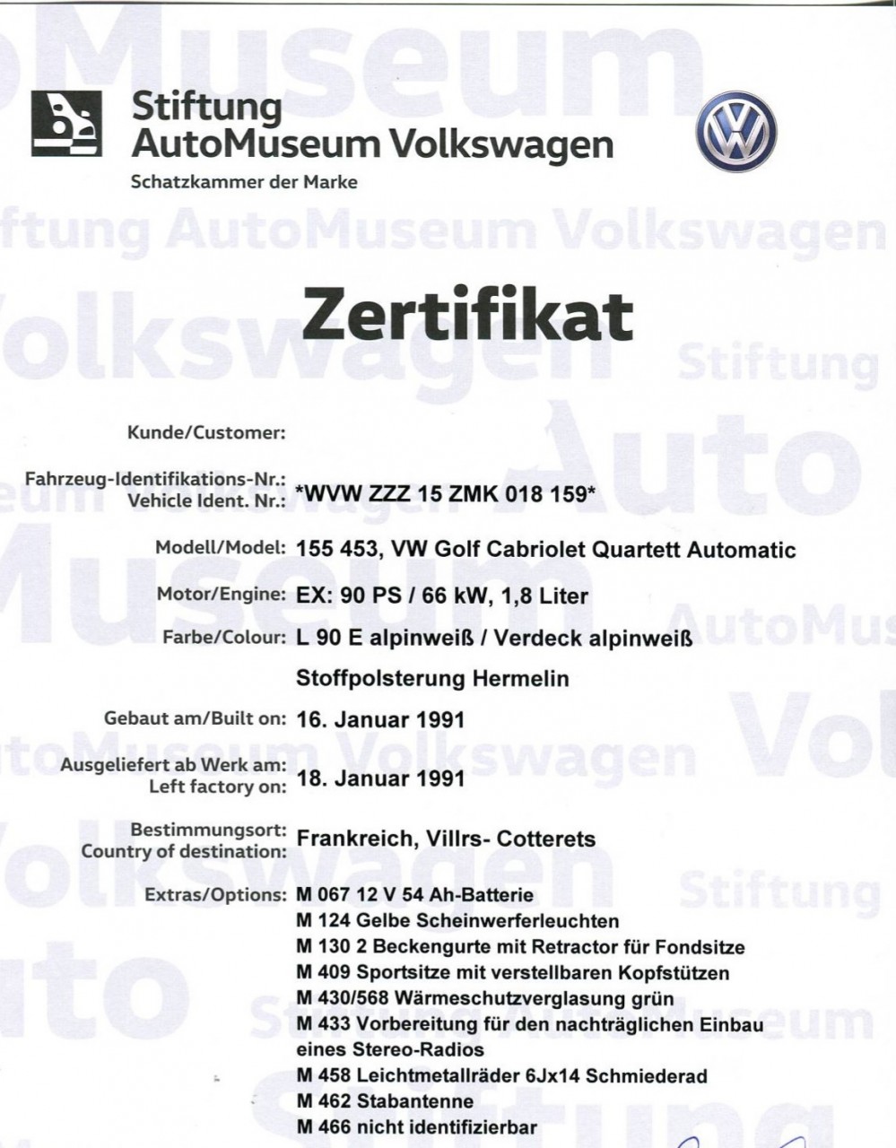 Passionné par les documents et les des détails de la Golf 1 Cabriolet et voulant posséder le fameux certificat de l'Automuséum de Wolfsburg, j'en fais donc la demande en Allemagne pour les deux cabriolets (Bel Air et Classicline).