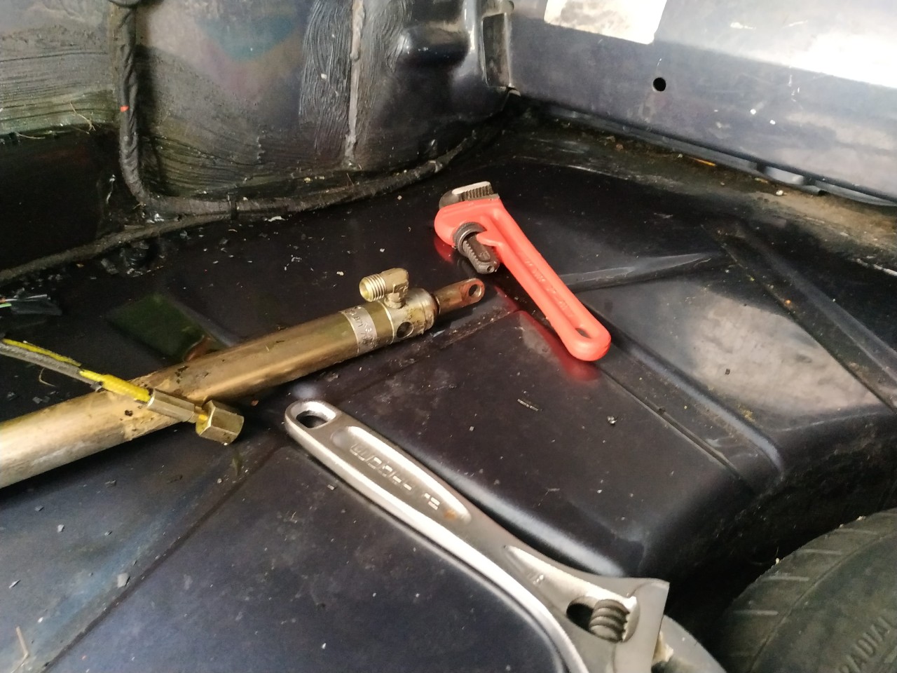 Perso j'ai utilisé un pince à griffe pour bloquer le vérin et clé à molette pour dévisser l'écrou (ça doit être une clé de 15 normalement mais je ne la trouvais plus). Il faut souquer comme un dingue ! C'est très très très serré.