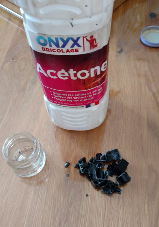 Ici j’ai eu besoin de 3 briques coupées en morceaux que j’ai laissé fondre dans l’acétone pendant 5h.