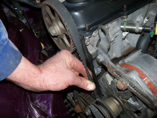Nouvelle courroie en commençant par le bas, brins tendus sans décaler les roues dentées, c'est pas facile...