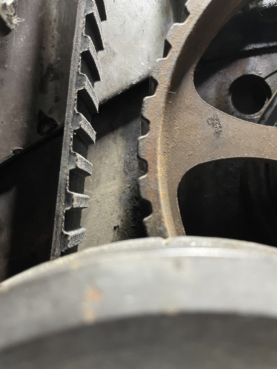 Visuellement en regardant par dessus l’alignement semble ok et est le même qu’avant démontage mais si on regarde l’alignement de face pour moi il y a une dent de décalée entre les deux, il faudrait que je remonte d’une dent la roue crantée d’accessoire.