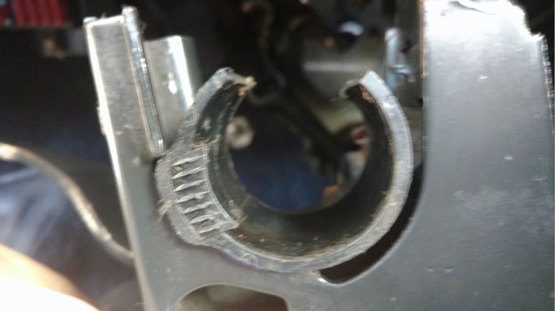 5 – Couper le rilsan qui fixe la cosse sur la colonne de direction, et l’écarter pour que le pédalier puisse coulisser le long de la colonne.
