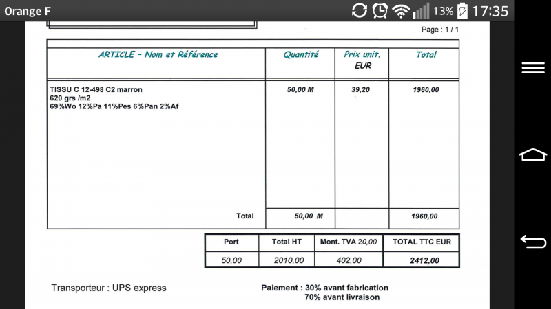 Le tarif final pour la production des 50 mètres de tissus havanna est donc de 39,20 euros hors taxes (environs 47 euros TTC)... hors frais de port (environs 20 a 30 euros pour le rouleau donc a peu pres 4 a 6 euros de plus par personne)...