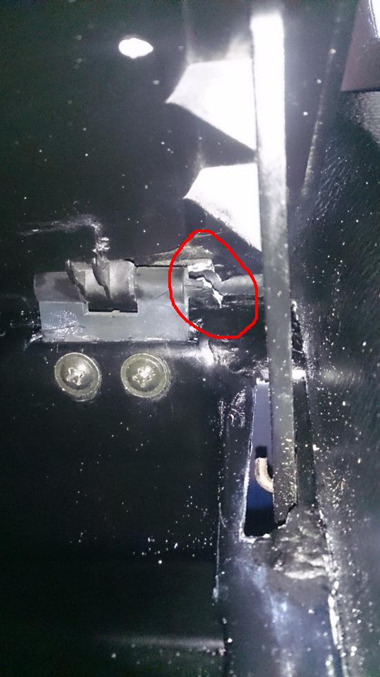 Pour ce qui est de la réparation du bac de boîte à gant, ça va, ça a l'air de tenir. C'est au niveau du couvercle que ça s'était fêlé (avant que je ne tente la réparation, il y avait du jeu qui a fêlé l'endroit entouré en rouge :