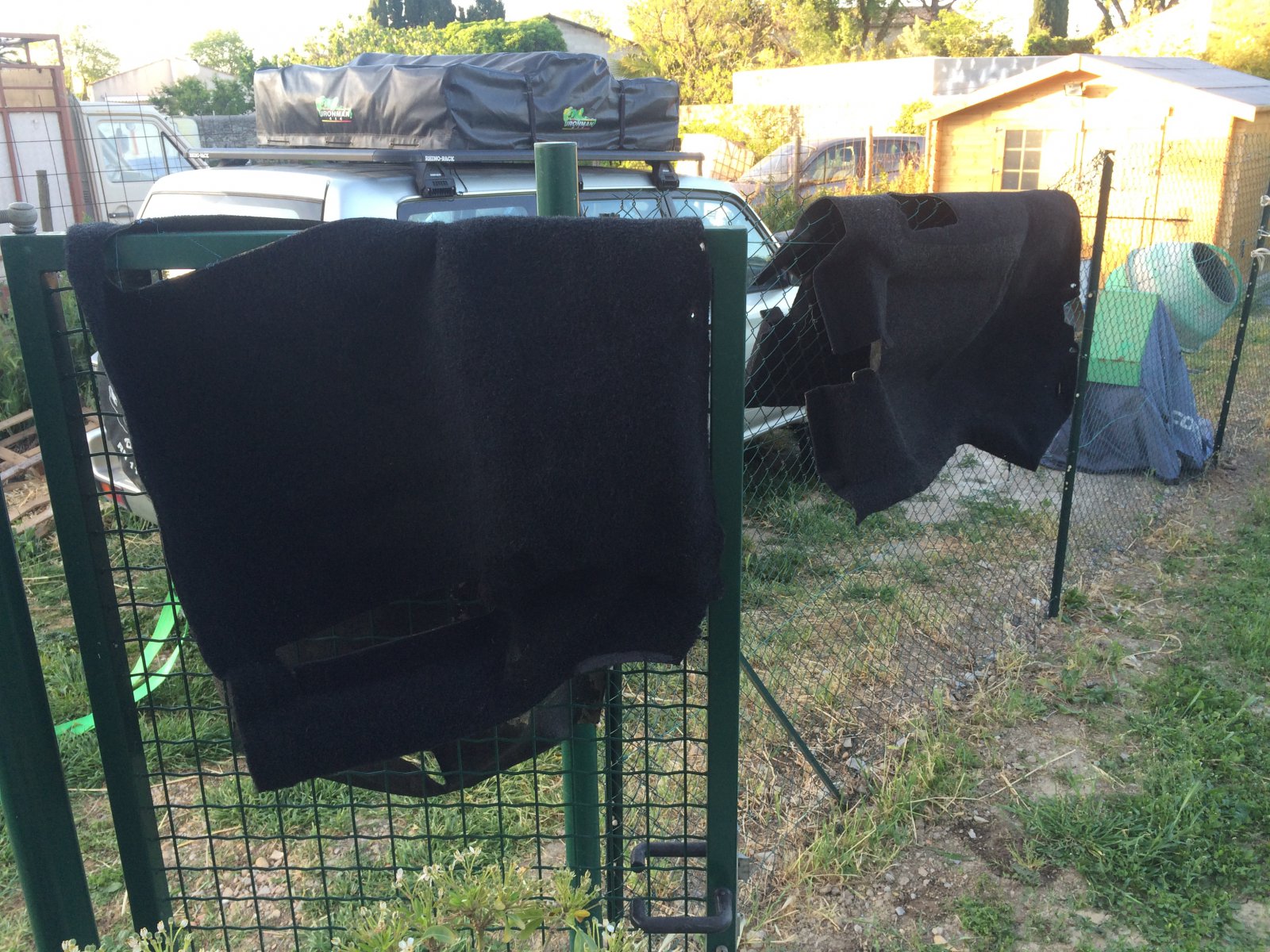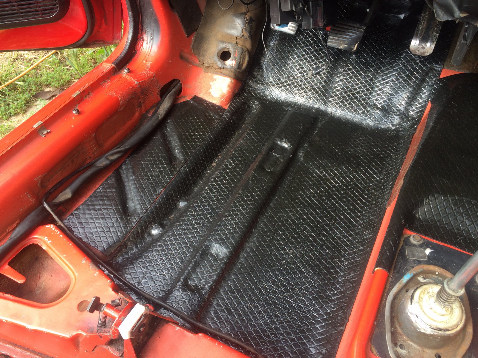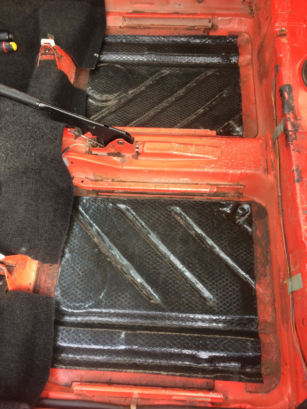 j'ai traité de la rouille sur le renfort fixé sur le plancher, j'ai dégraissé partout et découpé mes plaques d'isolant phonique et je m'apprête à les coller au décapeur thermique