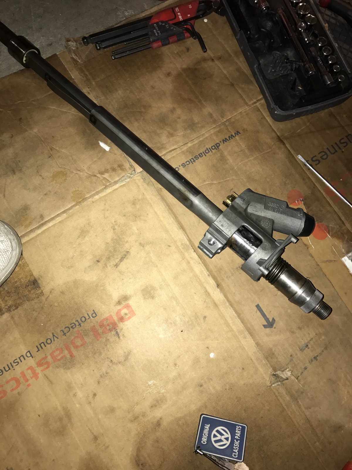 j'ai dévissé l'écrou qui tient la colonne à la rotule de direction, et tenté de tirer sur le volant pour faire sortir la colonne. Evidemment, ça ne vient pas :)