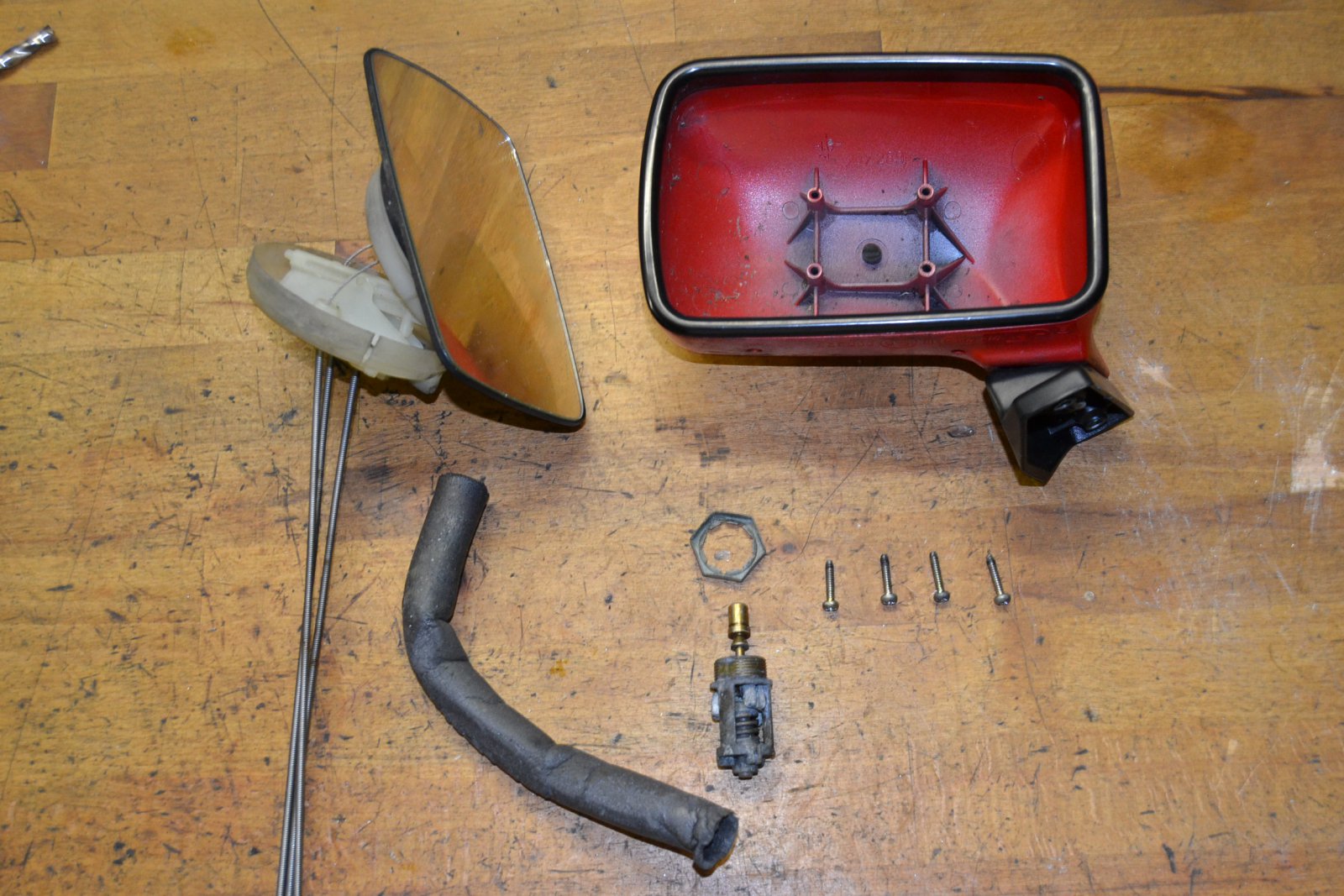 J'ai démonté mes rétroviseurs pour repeindre la coque. Je n'ai malheureusement pas fait de photos pendant le démontage, mais je viens d'en faire avec les diverses pièces. Voici comment faire :