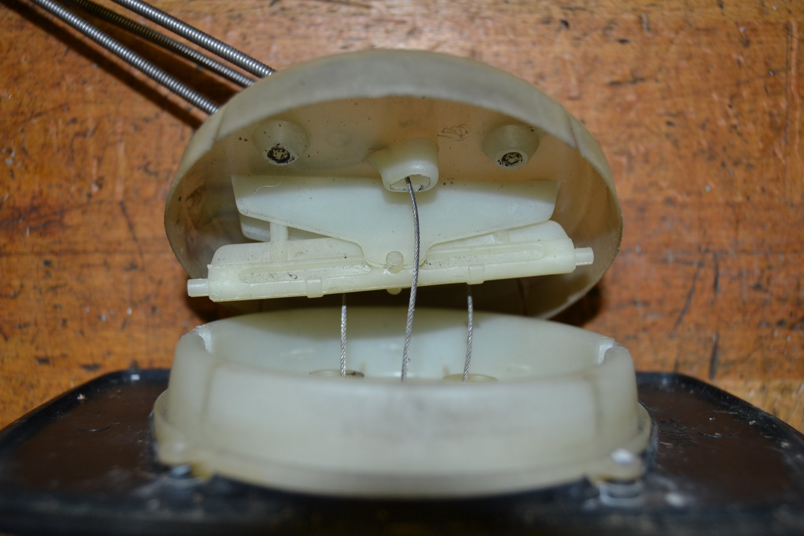 Ici c'est déjà démonté, mais on voit une des vis ainsi que les trous où elles se logent Si toutefois, le mirroir ne laisse pas assez de place pour démonter les 4 vis, vous pouvez déloger les gaines à l'arrière du mécanisme, ce qui donnera plus de marge. C'est pas évident car ça se fait "à l'aveugle".