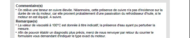 Voila je reviens vers vous j ai fais examiner mon huile les résultats sont plutôt rassurant à part un excès de cuivre et un peu d eau .