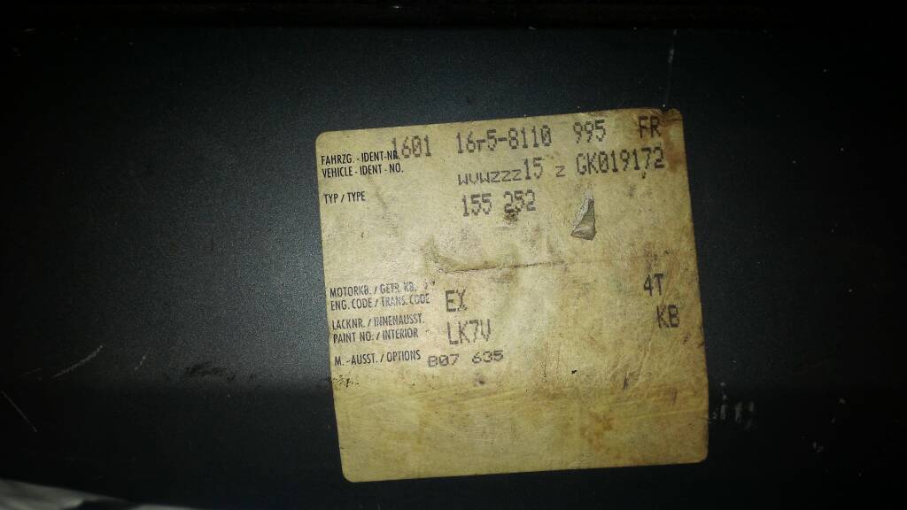 bonsoir à tous les membres. voici l'étiquette de coffre de ma golf du 09/93 1.8 i 98 chvx . j'ai bien lu quelques posts mise à part le code couleur et le type de boîte. je n'ai pas réussi à identifier le reste. merci l'équipe