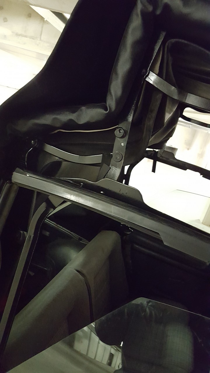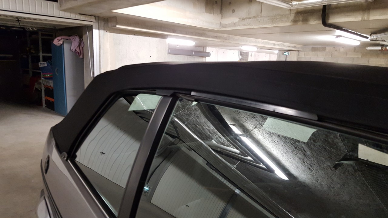 Problème : la capote ne tient pas en position ouverte (impossible de l'accrocher sur les deux sécus de verrouillage), même en forcant, comme si la matelassure était trop épaisse. Lorsqu'il me l'a livré, le sellier m'a dit que cela était normal, que la matelassure allait se tasser. Autre petit problème, il y a comme un bourlet sur chaque côté le long des vitres laissant voir exagérement les joints latéraux.