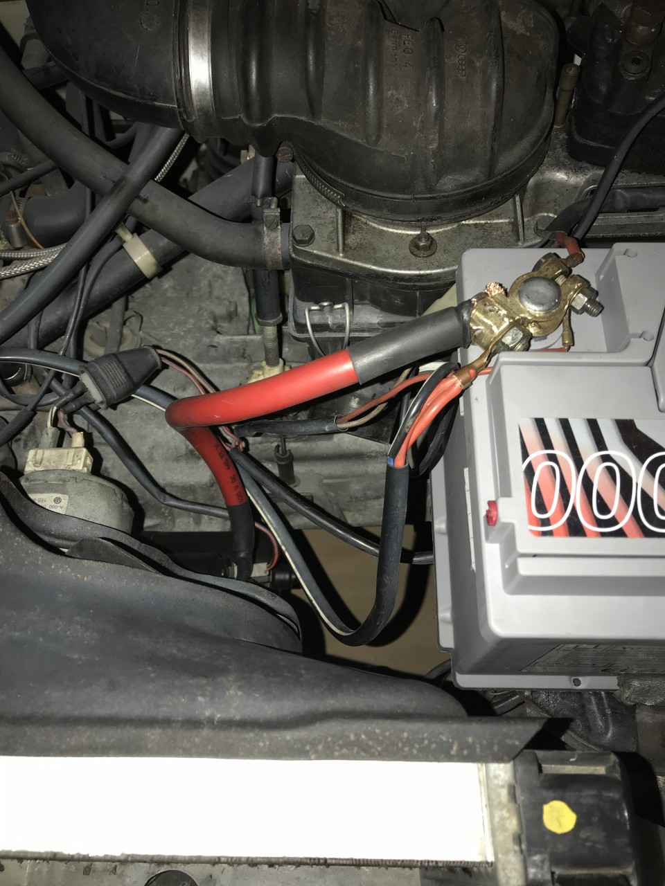 Au rayon des tvx, il me restait du câble à batterie et des cosses de mon ex racecar du coup j'ai changé le "gros" + qui va au démarreur et tout le - en meulant proprement les contacts caisses et support moteur.
