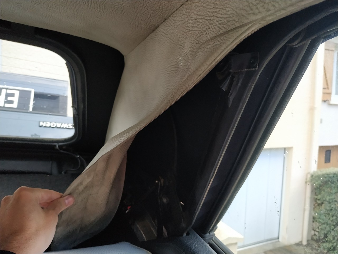 Ensuite on rentre dans la voiture et on écarte le ciel de toit pour avoir accès à l'extrémité du vérin.