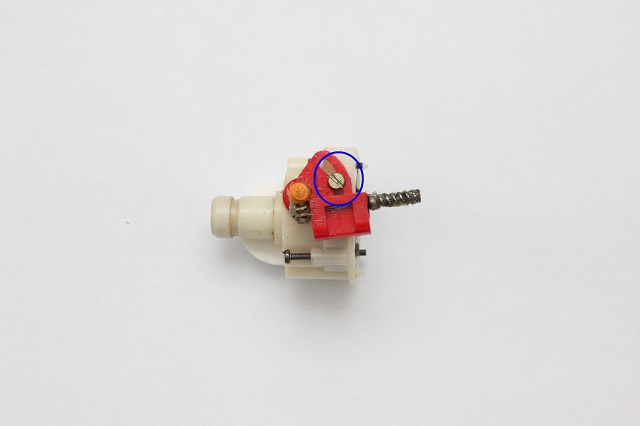 Retirez la visse restante et les engrenages puis pulvérisez du dégraissant par le trou en bleu pour nettoyer l'intérieur.