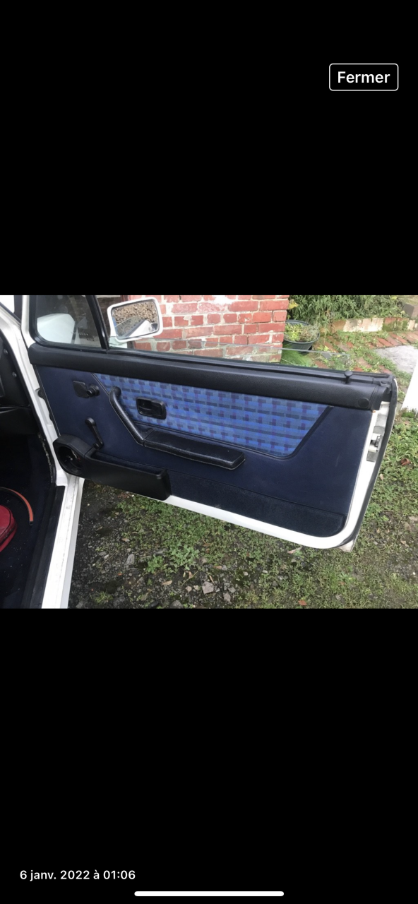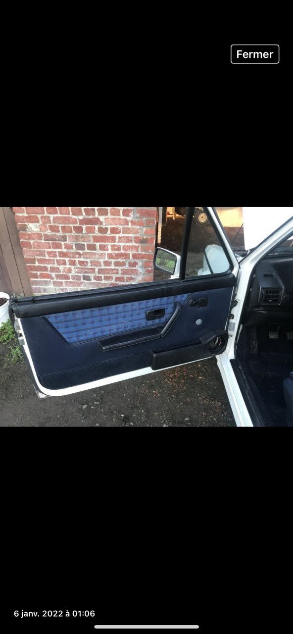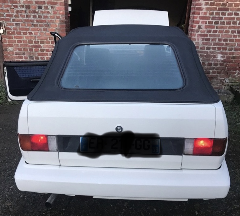 Alors c’est visiblement une golf 1 cabriolet 1800 GLI de 1991 112 Cv moteur 155DX2 finition quartere 2 avec intérieur bleu Maurice et capote idem