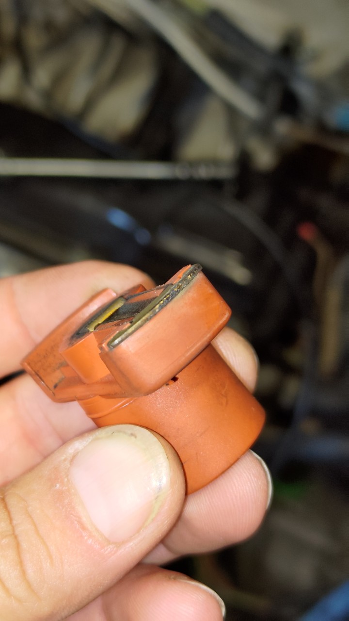 Au remontage , la voiture ne tournait pas bien rondmais mieux qu'avant le nettoyage des injecteurs surtout sur le ralenti, et elle tournait parfois sur 3 cylindres... j'ai également jeté un oeil à l'allumage : la fiche provenant de la bobine sur la tête d'allumeur s'est littéralement désintégrée quand je l'ai touchée.... o_O