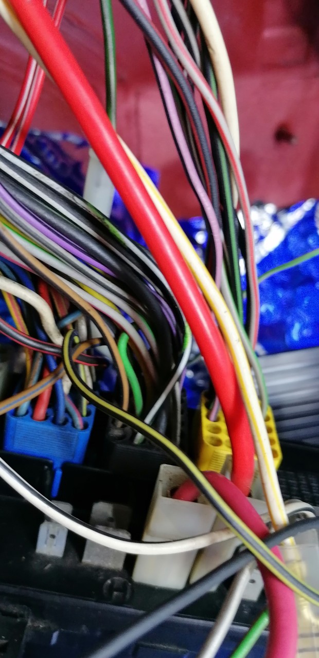 Concernant ce que tu m'as demandé, le vert / noir part de la fiche bleue, on le voit bien sur la photo et il a une cosse métallique non isolée. Les fils marron / noir et marron / bleu partent du relais en haut tout à gauche et ont des connecteurs mais je ne vois pas où ils peuvent se connecter. A priori je ne vois rien qui peut venir sur ce fil gris blanc... Ca avance pas mal quand même, on verra bien au moment du premier démarrage.