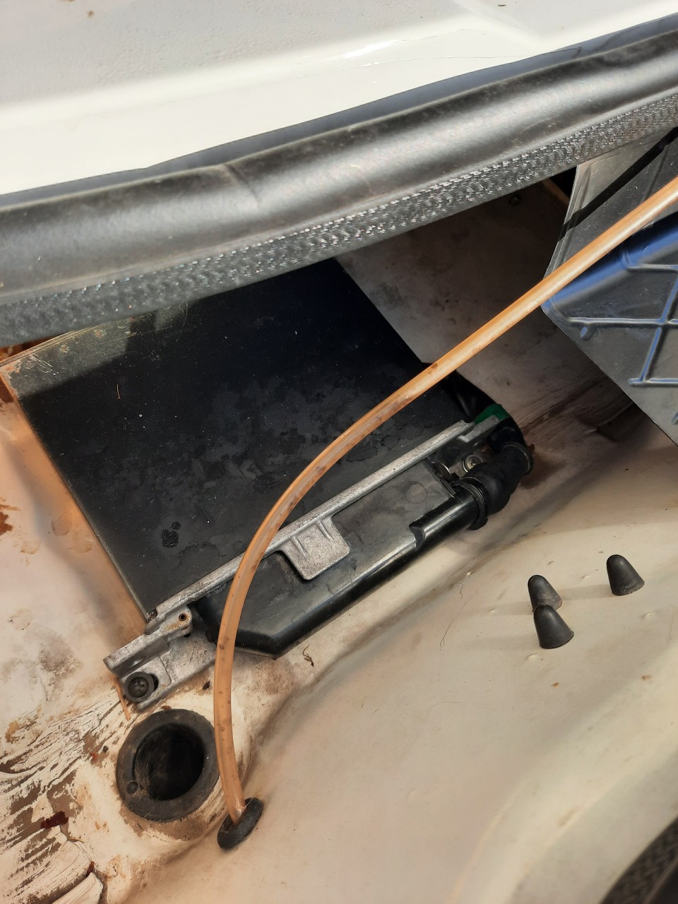 La position du calculateur n'est pas normale, les vis de fixation ne correspondent pas. Le boitier bouche un orifice de forme rectangulaire. Je te confirme que rien ne repart du calculateur. je serais interessé si tu as des photos d'un calculateur d'origine à son emplacement.