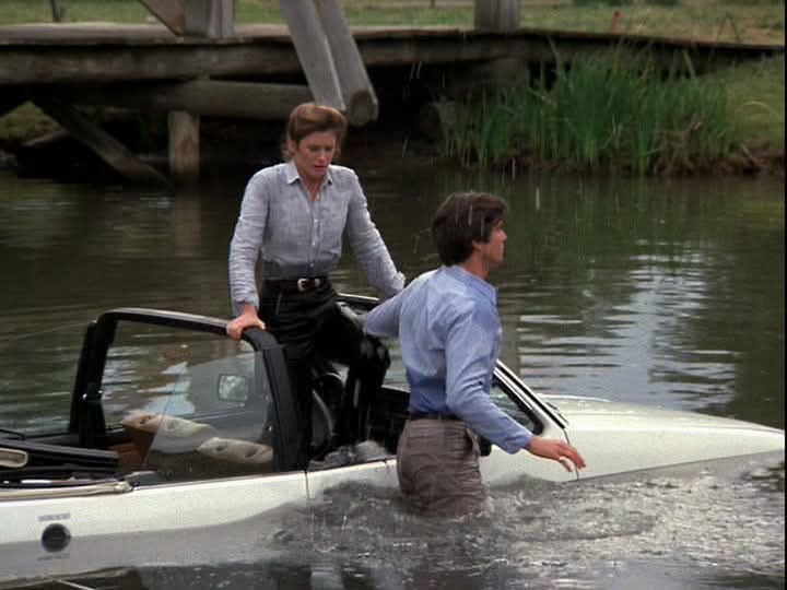 Une poursuite et cascade en cabrio alors que celle ci est poussée par un Pick Up ! La Cabrio finie dans l'eau !