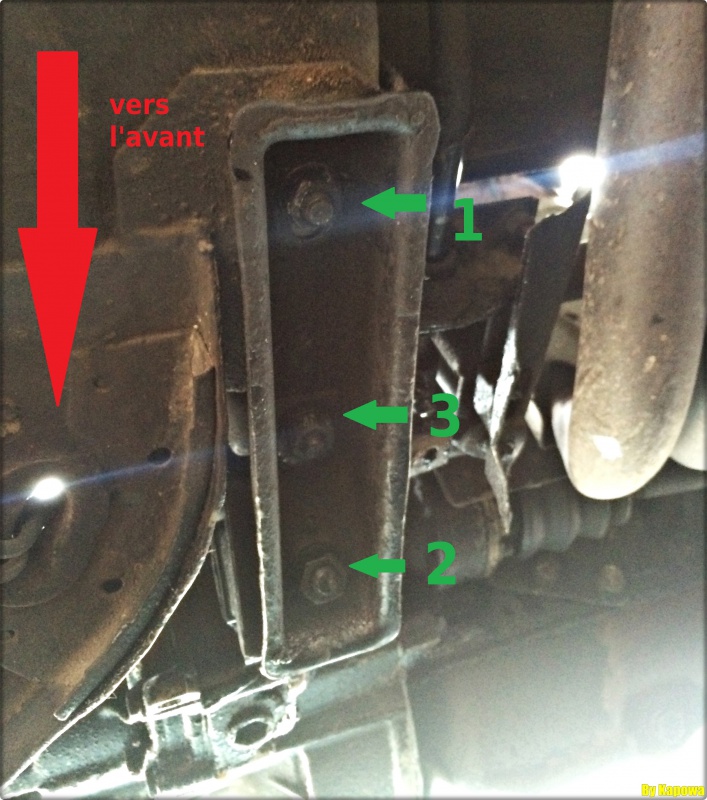 On dévisse la pièce allongée sous le support en enlevant les 2 boulons de 17 et les rondelles vers l'arrière de la voiture et pareil avec le boulon de 19 avec rondelle vers l'avant.