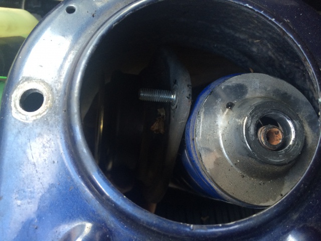 Procédure de retrait, on pousse sur la butée, pour libérer les deux vis de la butée puis on incline le tout entre le puis d'amortisseur et le fileté.