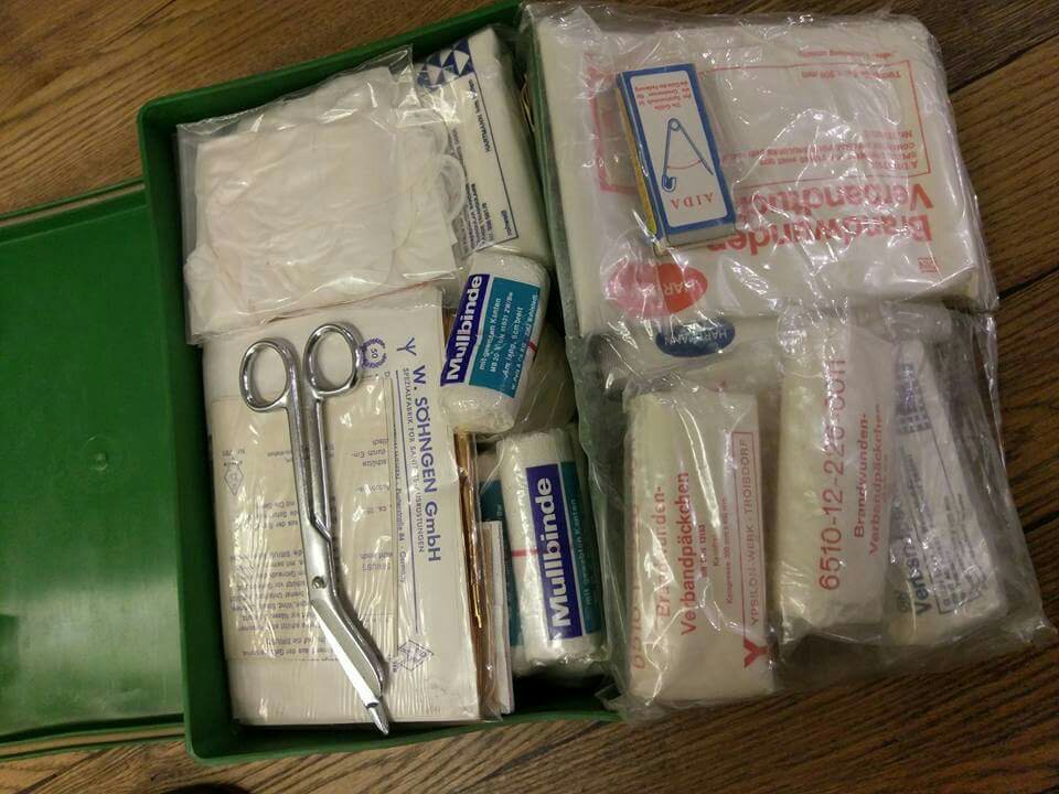 je les aient dans le coffre tous les deux ! la boite du triangle a un peu souffert du temps et la trousse de secours est complète je pense avec les premiers secours d origine.