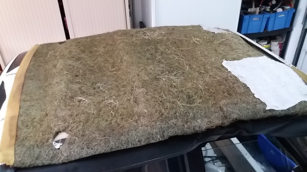 Et puis, je me suis dis que remettre une vieille matelassure bricolée avec une capote neuve, ce n'était pas top alors, j'ai décidé de tout changer. J'ai donc commandé une matelassure complète sur comptoir du cabrio (et hop 250 €). A l'arrivée, la matelassure n'est pas en crin végétal mais en espèce de crin caoutchouc (ça ne me plait pas trop) et en plus, elle est livrée en kit