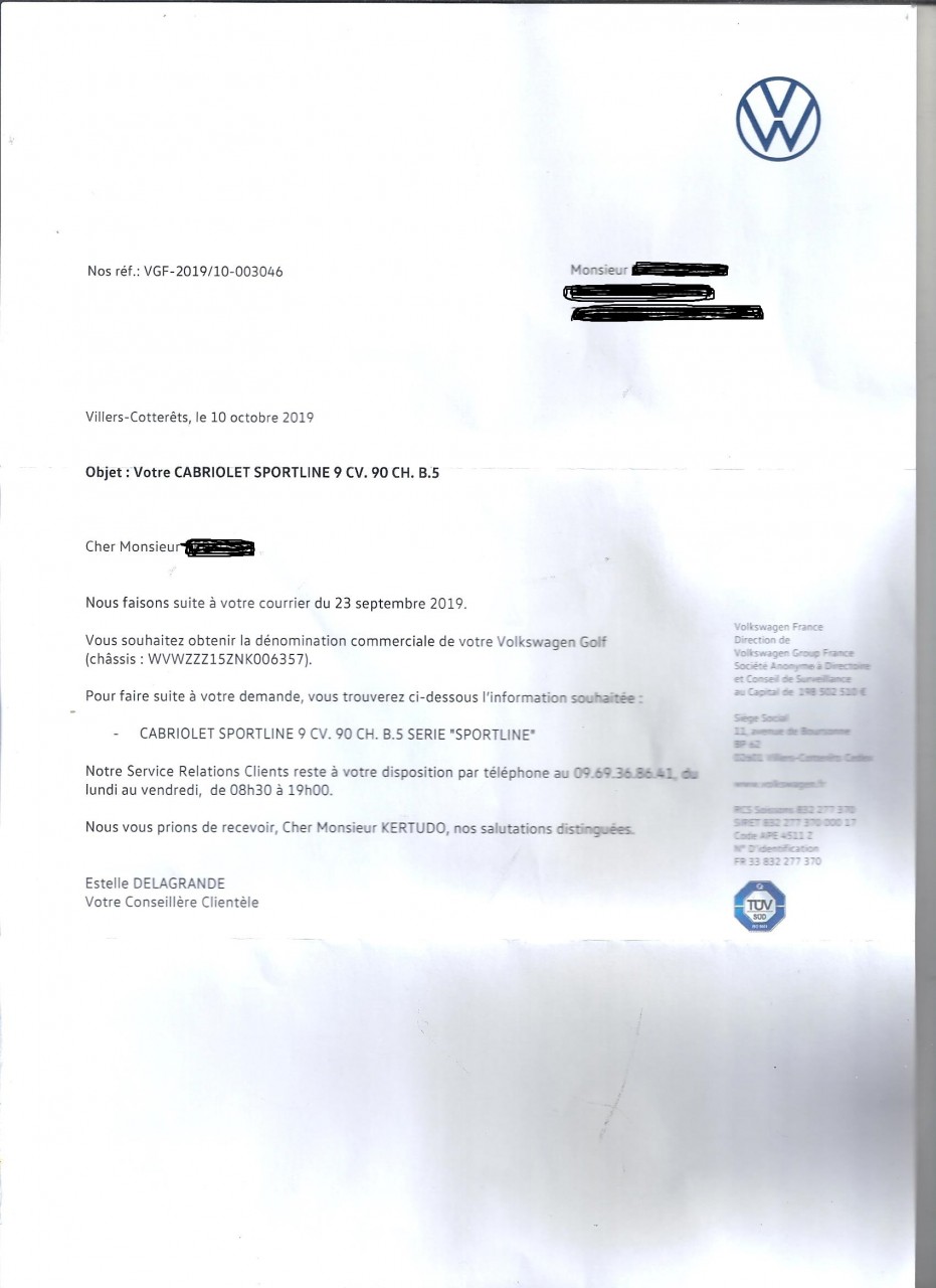 Je me suis rendu dans un garage VAG qui m a donné cette adresse: Volkswagen France service homologation 02600 Villers Cotterets