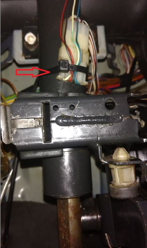 5 – Couper le rilsan qui fixe la cosse sur la colonne de direction, et l’écarter pour que le pédalier puisse coulisser le long de la colonne.
