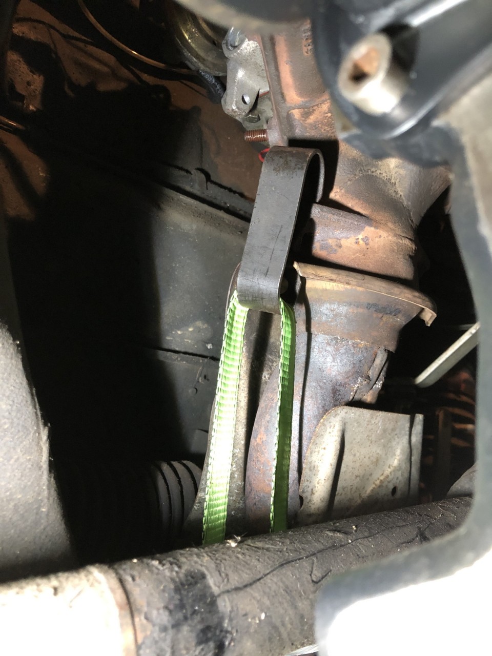 Agrafe posé sur le collecteur et mis en place du dessous en tirant sur la boucle inférieure avec une sangle qui tire sur un axe en appui sous les traverse de la voiture