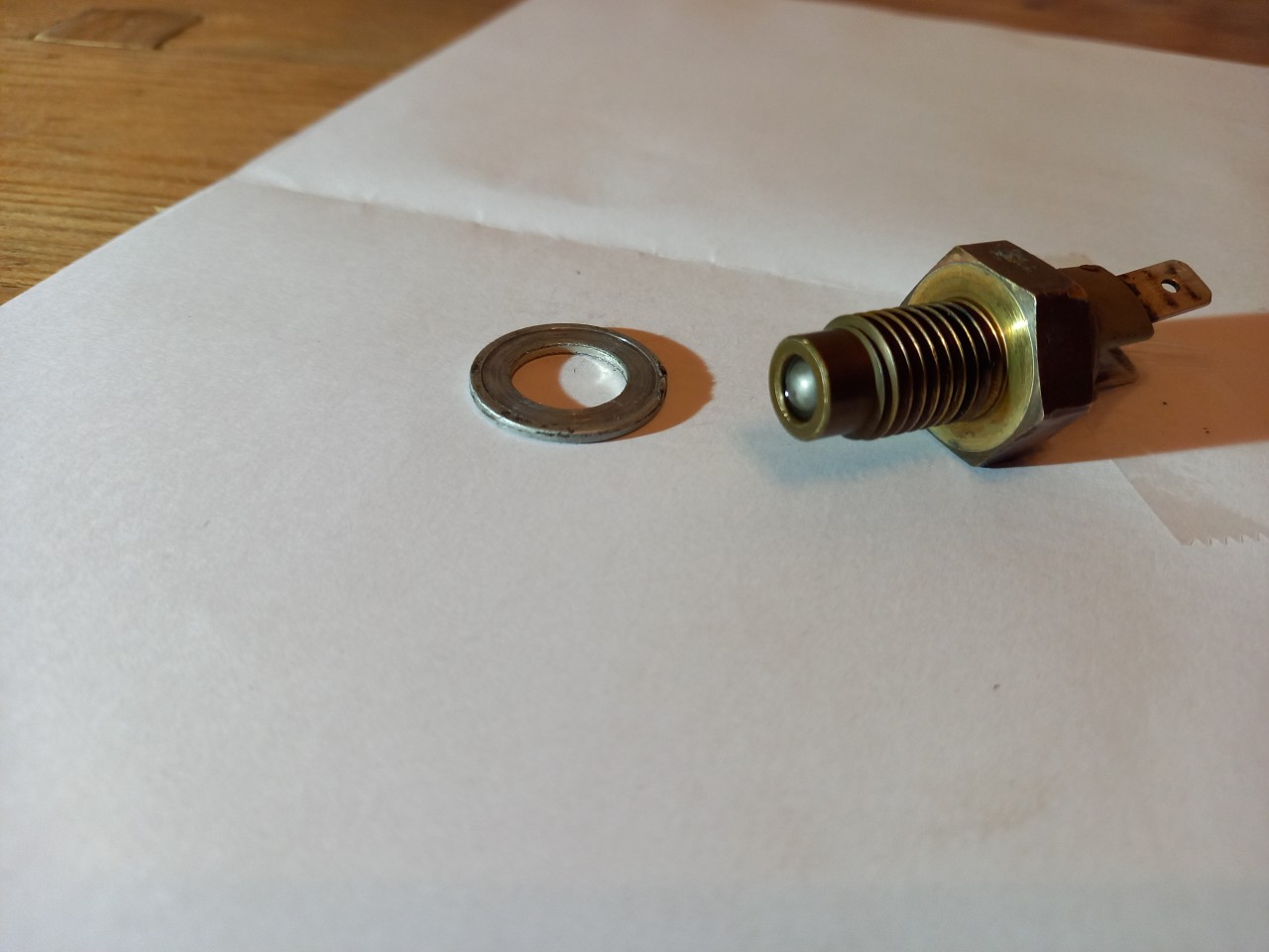 Voici le contacteur défectueux. On peut voir à l'extrémité la petite bille grippée et rétractée qui faisait contact en permanence et la rondelle d'origine que j'ai enlevée qui m'a permis de gagner 1 mm et faire un nouveau contact dans la boîte de vitesse.