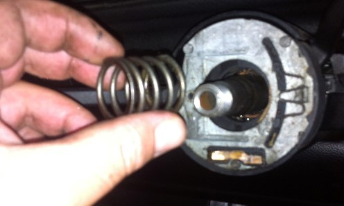 serrer l'arrache et la pièce sort toute seul sans forcer puis le ressort à la main mettre en place la douille plastique présenter au début du topic, j'ai eu des doutes et un peu galérer pour l'enfoncer je croyais que les trous devait correspondre sur la colonne mais non il faut simplement l'enfonce avec une petite cale et un marteau!! Remonté le volant et sérré!!