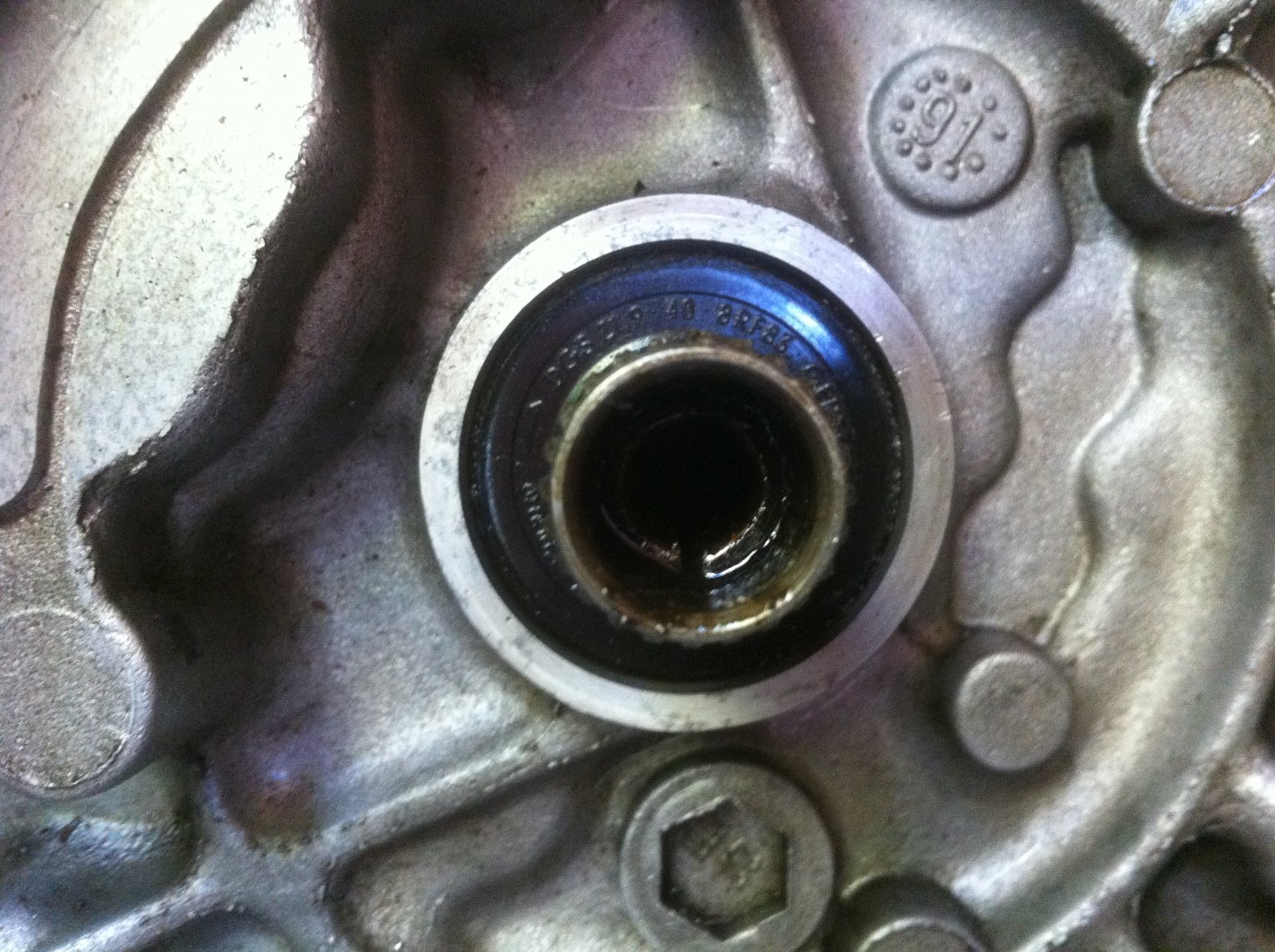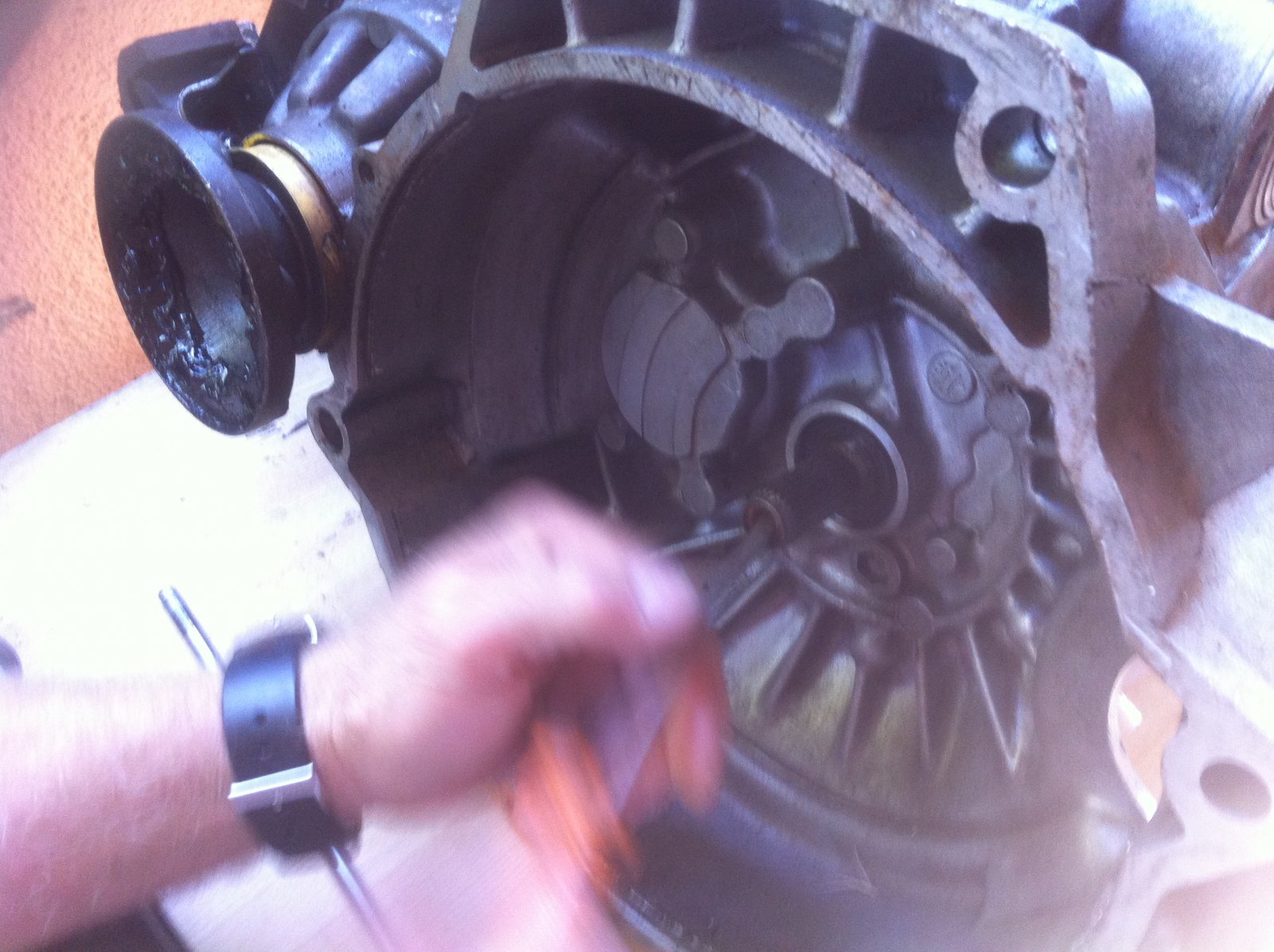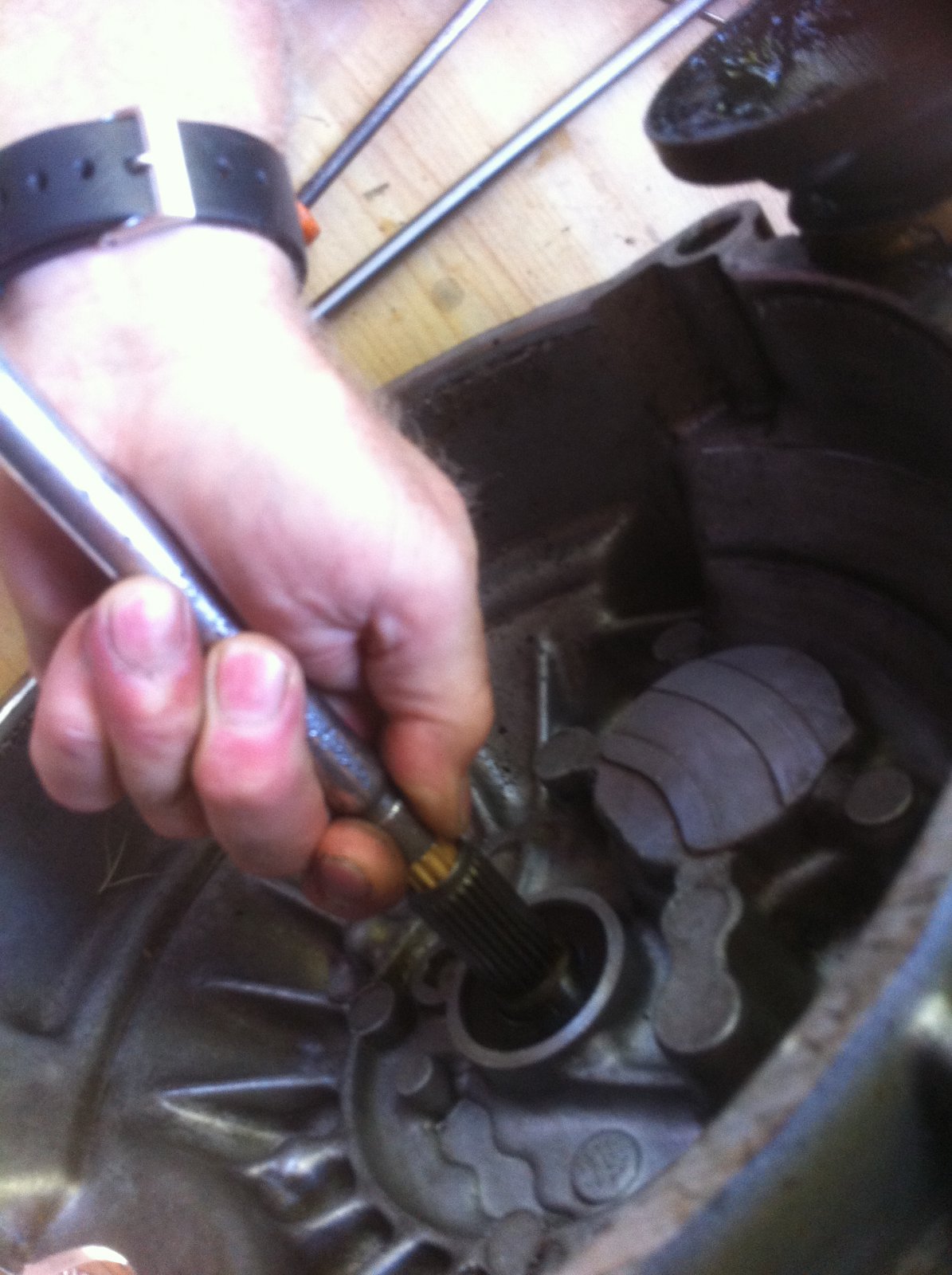 On accède alors à la bague à bronze, ici nous avons utilisé un petit arrache roulement facom en essayant de l'attraper par derrière mais sans succès