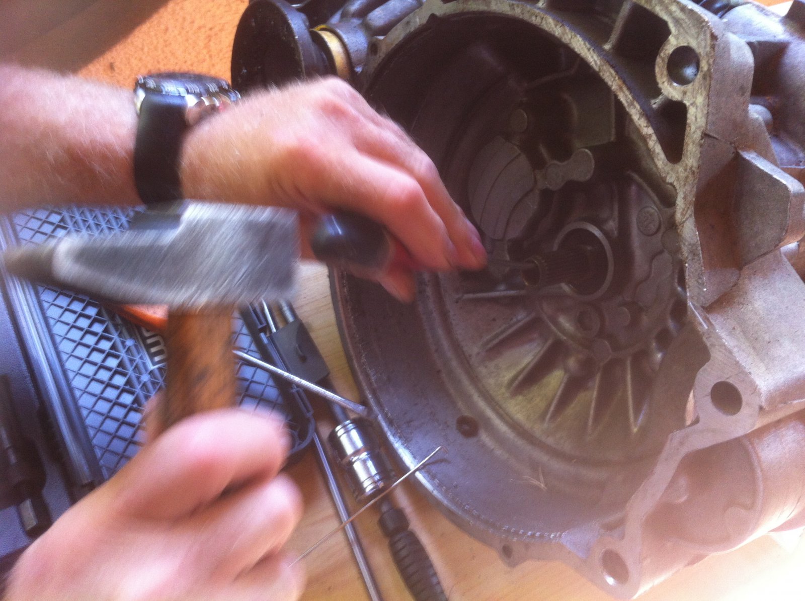 Après avoir nettoyé l'intérieur de l'arbre, on peut maintenant enfoncer la nouvelle bague avec un outils plat de même taille sans forcément la mettre en butée, juste laisser la place pour le petit