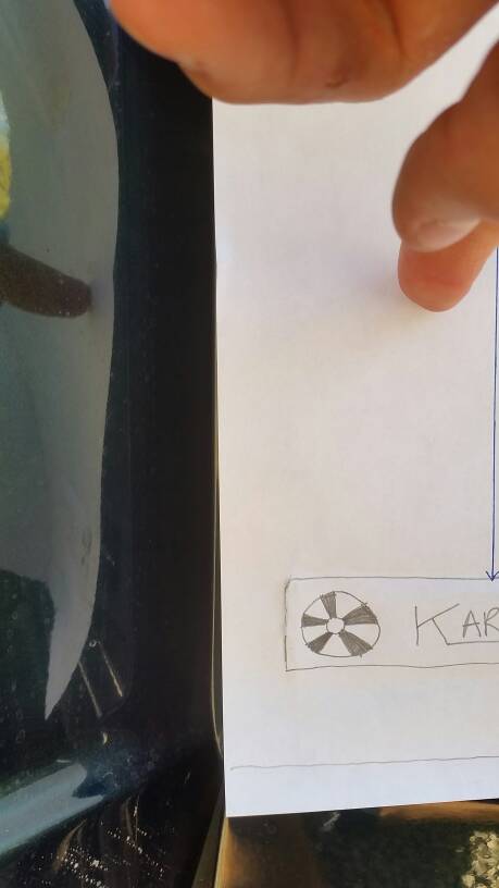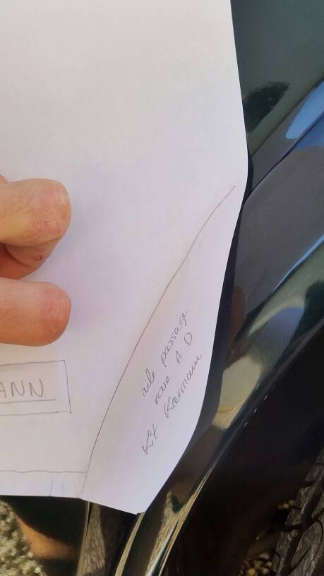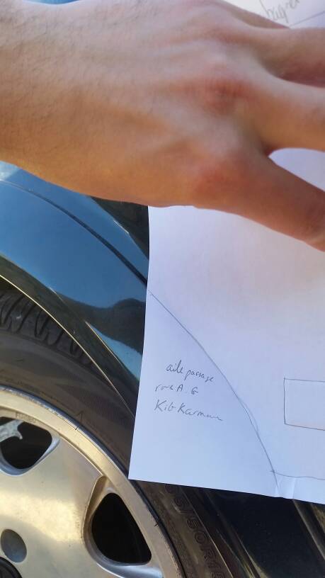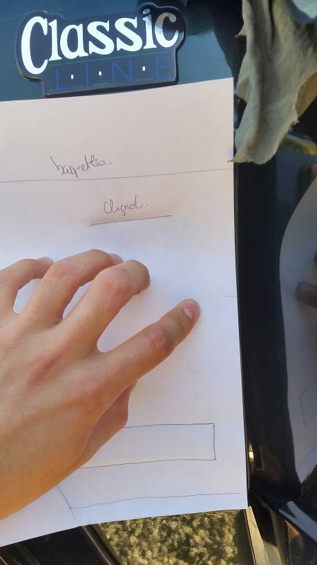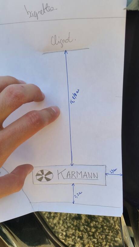 La feuille a servi de calque, que j'ai placé le long de la ligne de la baquette lattérale pour le logo "ClassicLine" et a hauteur du clignotant pour le logo "Karmann" afin d'avoir l'emplacement des logos et de pouvoir y reporter les côtes ensuite depuis les emplacements actuels sur la voiture.