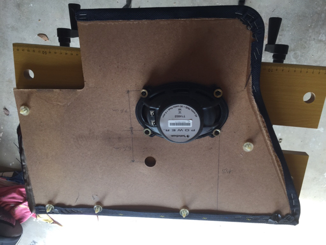 Deuxième étape lorsque vous avez sorti les panneaux il est nécessaire de faire 4 trous pour passer la grille de hp, je vous ai mis mes côtes sur une des photos afin que votre hp soit au bon endroit premièrement pour qu il y ai assez d espace pour l aimant et deuxièmement pour que la grille soit au bon endroit pour pouvoir se servir de la manivelle lève vitre