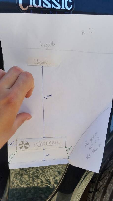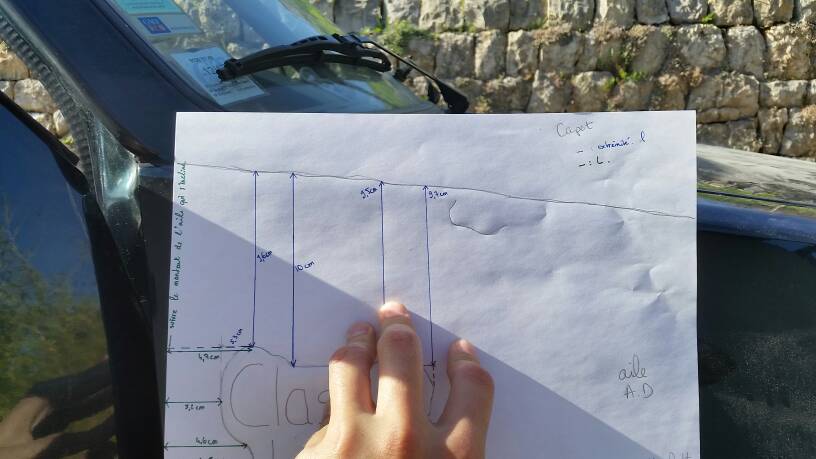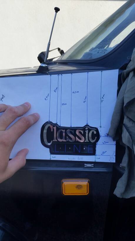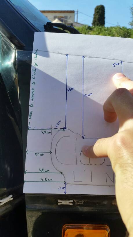 La feuille a servi de calque, que j'ai placé le long de la ligne de la baquette lattérale pour le logo "ClassicLine" et a hauteur du clignotant pour le logo "Karmann" afin d'avoir l'emplacement des logos et de pouvoir y reporter les côtes ensuite depuis les emplacements actuels sur la voiture.