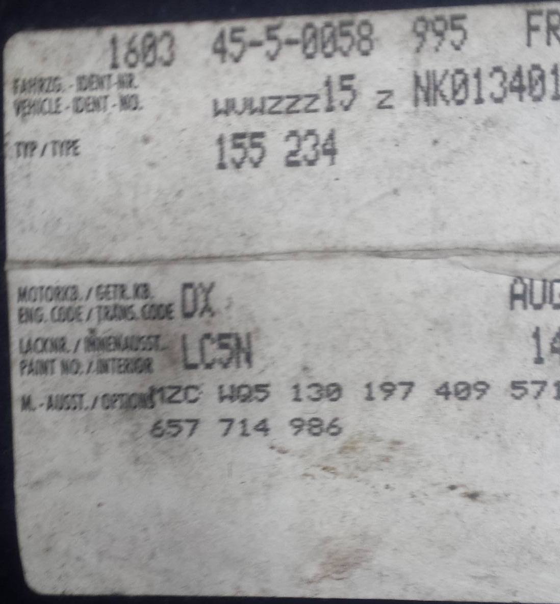 En parcourant le forum, j'ai trouvé dans la présentation d' un des membres une photo d'étiquette d'un modèle très similaire au mien. On pourrait même dire que nos voitures sont "jumelles" : même année et même série "Classic Line", même moteur DX, même couleur Bleu Nacré et je suppose même options... Les n° de châssis sont même très proches !