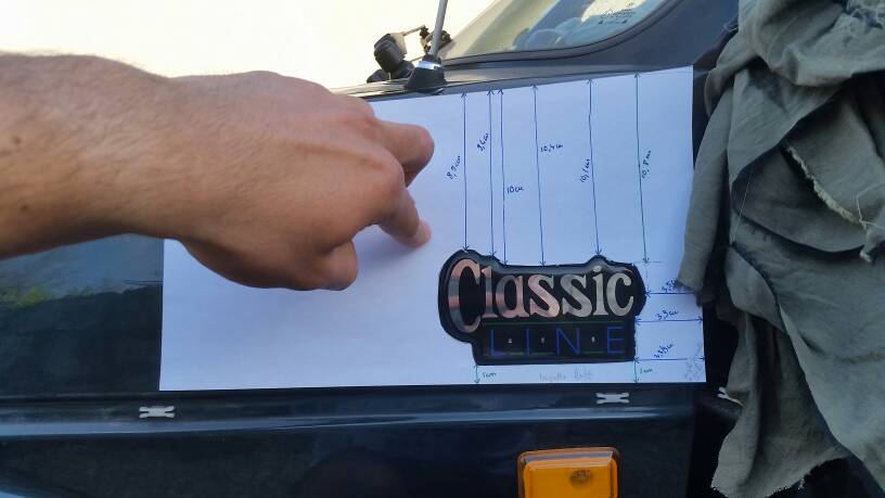 La feuille a servi de calque, que j'ai placé le long de la ligne de la baquette lattérale pour le logo "ClassicLine" et a hauteur du clignotant pour le logo "Karmann" afin d'avoir l'emplacement des logos et de pouvoir y reporter les côtes ensuite depuis les emplacements actuels sur la voiture.