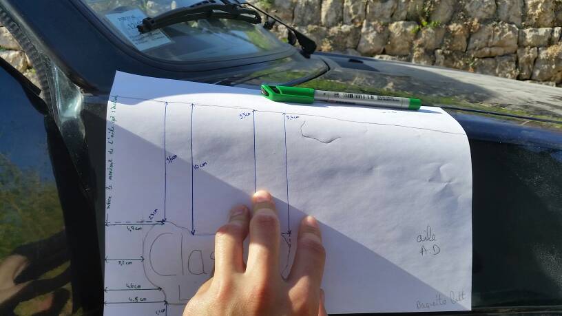 La feuille a servi de calque, que j'ai placé le long de la ligne de la baquette lattérale pour le logo "ClassicLine" et a hauteur du clignotant pour le logo "Karmann" afin d'avoir l'emplacement des logos et de pouvoir y reporter les côtes ensuite depuis les emplacements actuels sur la voiture.