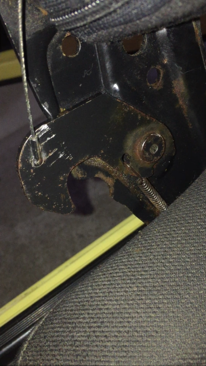 Au niveau des crochets qui servent à verrouiller le dossier dans sa position normale, en bas du siège, le mécanisme est totalement grippé. La poignée en haut du siège active bien le fil qui sert à relever le crochet, mais le fil tire dans le vide car le crochet ne bouge pas d'un mm. J'ai le même problème sur les 2 sièges. Bon ok ils pourraient etre bloqués en position normale sans qu'on puisse les rabattre, donc y'a pire, mais ça me frustre de me laisser marcher sur les pates par un mécanisme hyper basique comme ça. J'ai d'abord essayé le WD40, ça marche pas. Rubson dégrippant et lubrifiant, ça marche pas. J'ai réussi à faire bouger les crochets en tappant dessus au maillet (quand on a pas de technique, faut y aller à la zob), ils bougent très difficilement, et le truc s'est pas détendu. Y'a pas l'air d'y avoir de truc à desserrer ou démonter pour nettoyer, me trompe-je? Comment je peux faire?