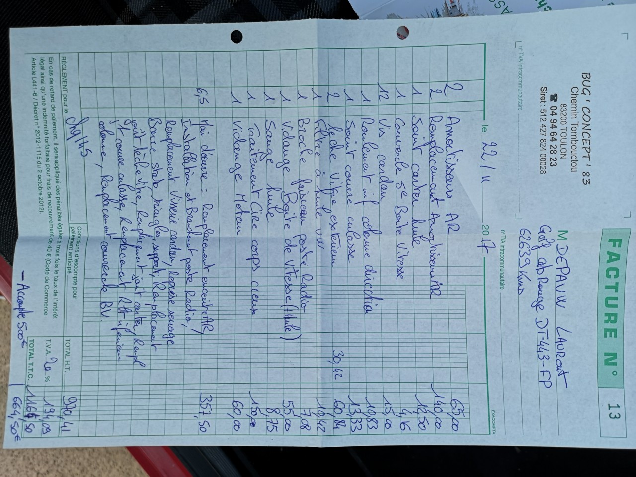 Je suis allé voir le mécano qui l'entretiens (bug concept 83), le gars très sympa, surpris d'entendre la mise en vente du véhicule qui me confirme l'état impeccable et la rigueur quasi psycho (pourvu qu'il ne lise pas!) du proprio.